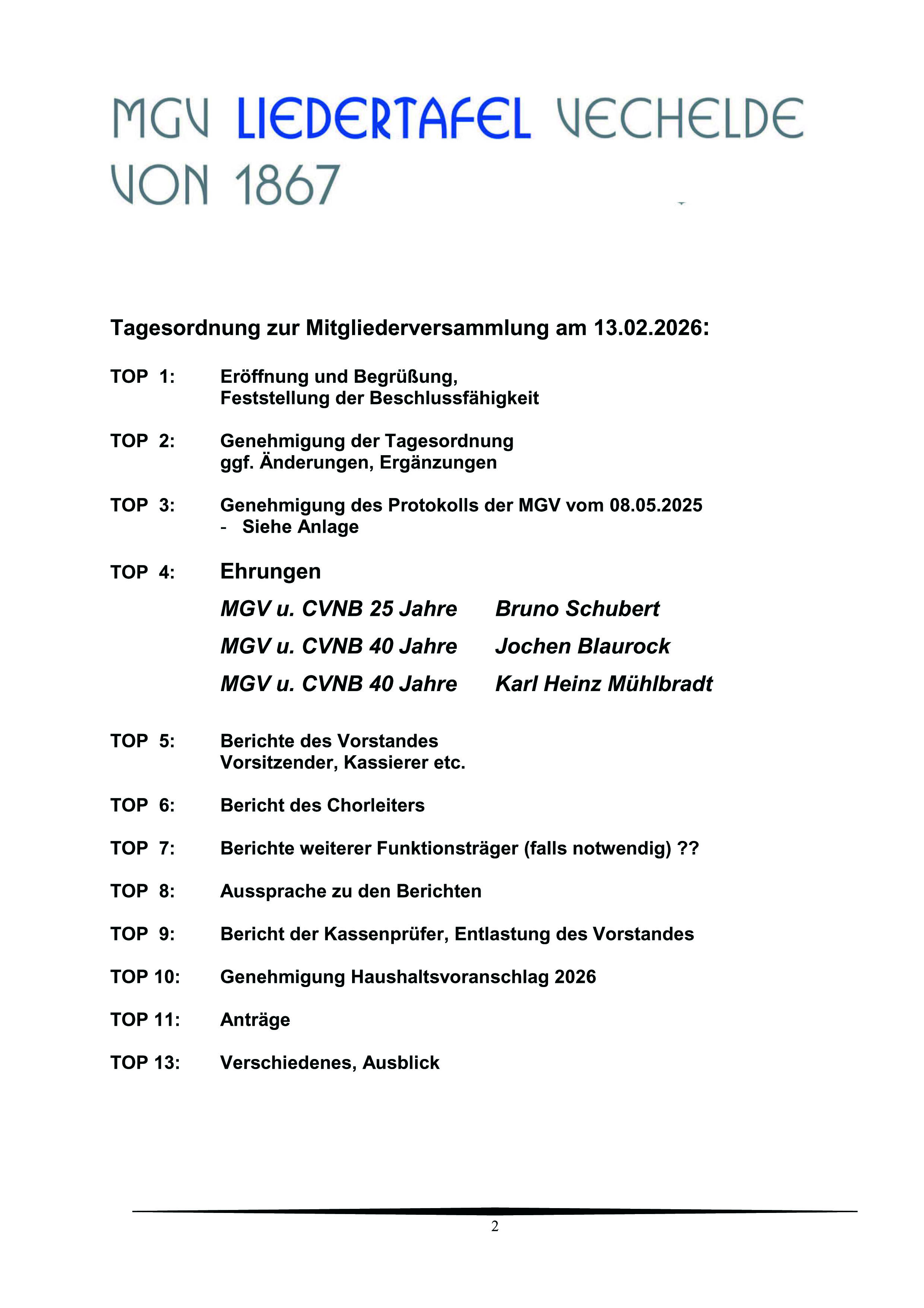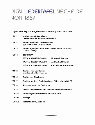 Die Mitgliederversammlung 2026 des Männergesangverein Liedertafel Vechelde von 1867 findet am Freitag, den 13.Februar 2026 im Bürgerzentrum Vechelde, Nebengebäude links, statt. Beginn ist um 18.00 Uhr.